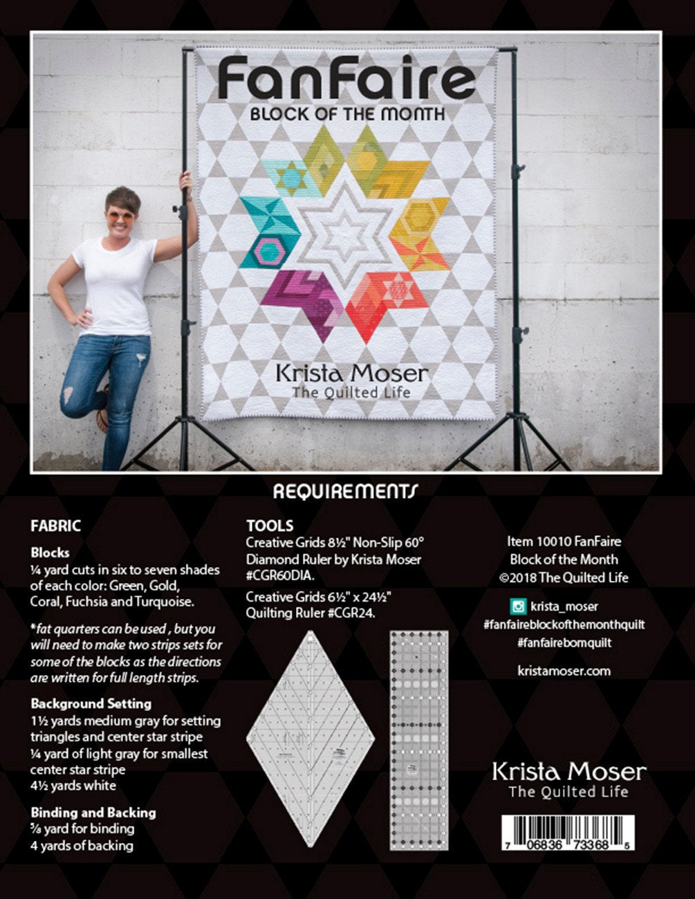 FanFaire, Block of the Month is a six-month block of the month. Each block is made twice totaling twelve blocks. Every block teaches you a new way to use the Creative Grids 60 Degree Diamond Ruler, designed by Krista Moser.