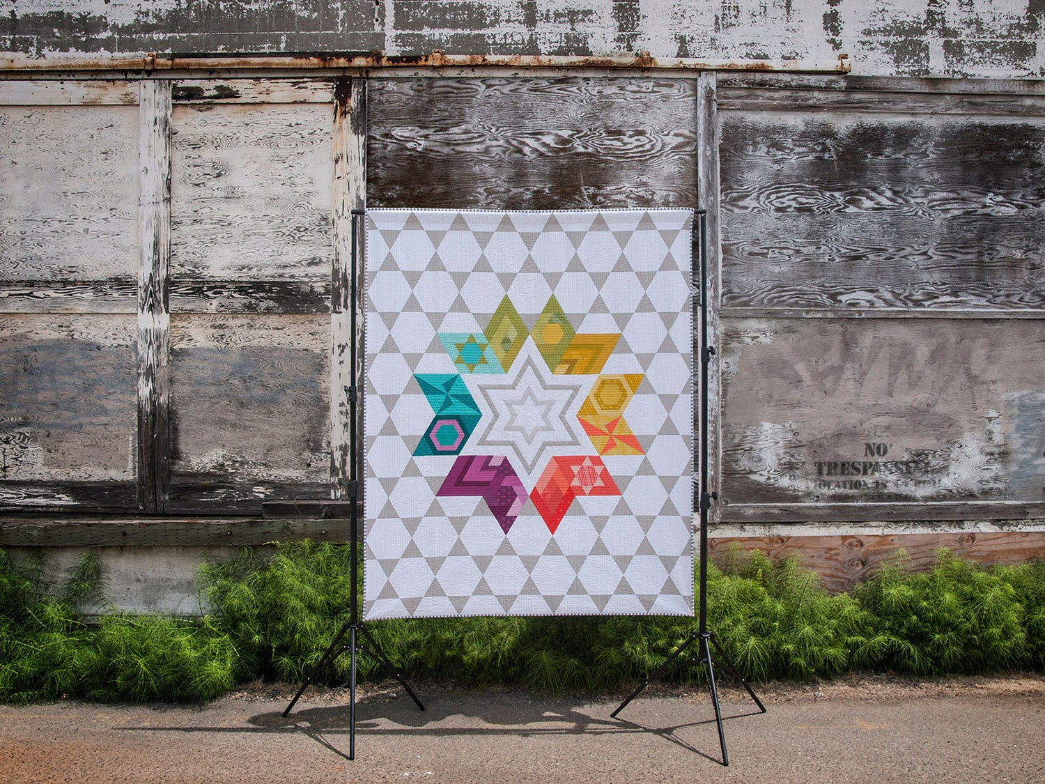 Cut a combination of diamonds, triangles, hexagons, parallelograms and trapezoids to create this fun quilt, and all with one ruler! This quilt goes together fast and is oh so striking!