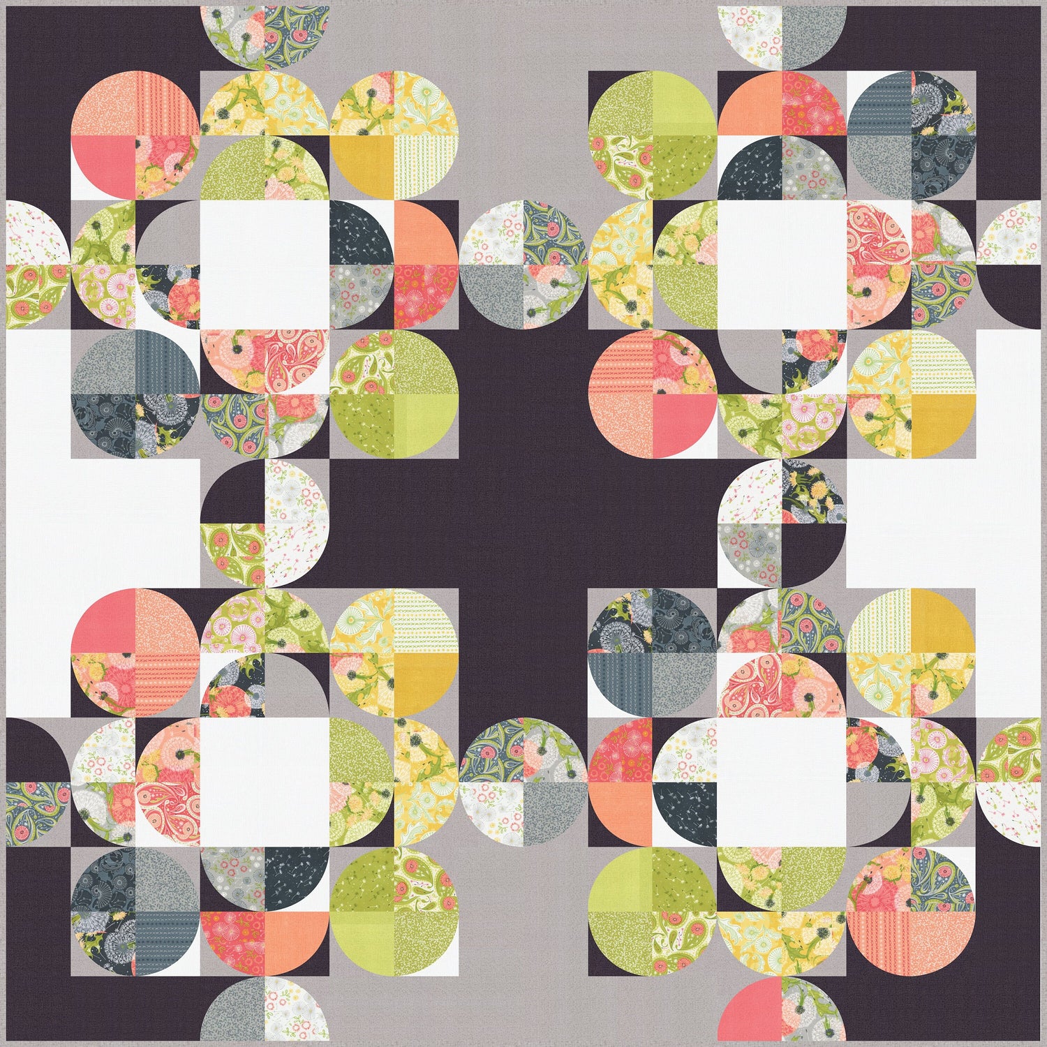Use a charm pack, layer cake, or fat quarters to make this quilt of curves that radiate out from a center square. The background is just as important as the prints with 3 background colors adding movement and contrast. Make as a small wall quilt or larger lap size. Consider optional curved corners. Paper template included but a Creative Grids Circle Savvy Ruler is recommended in instructions with notes on which ruler cut lines to use for this project.