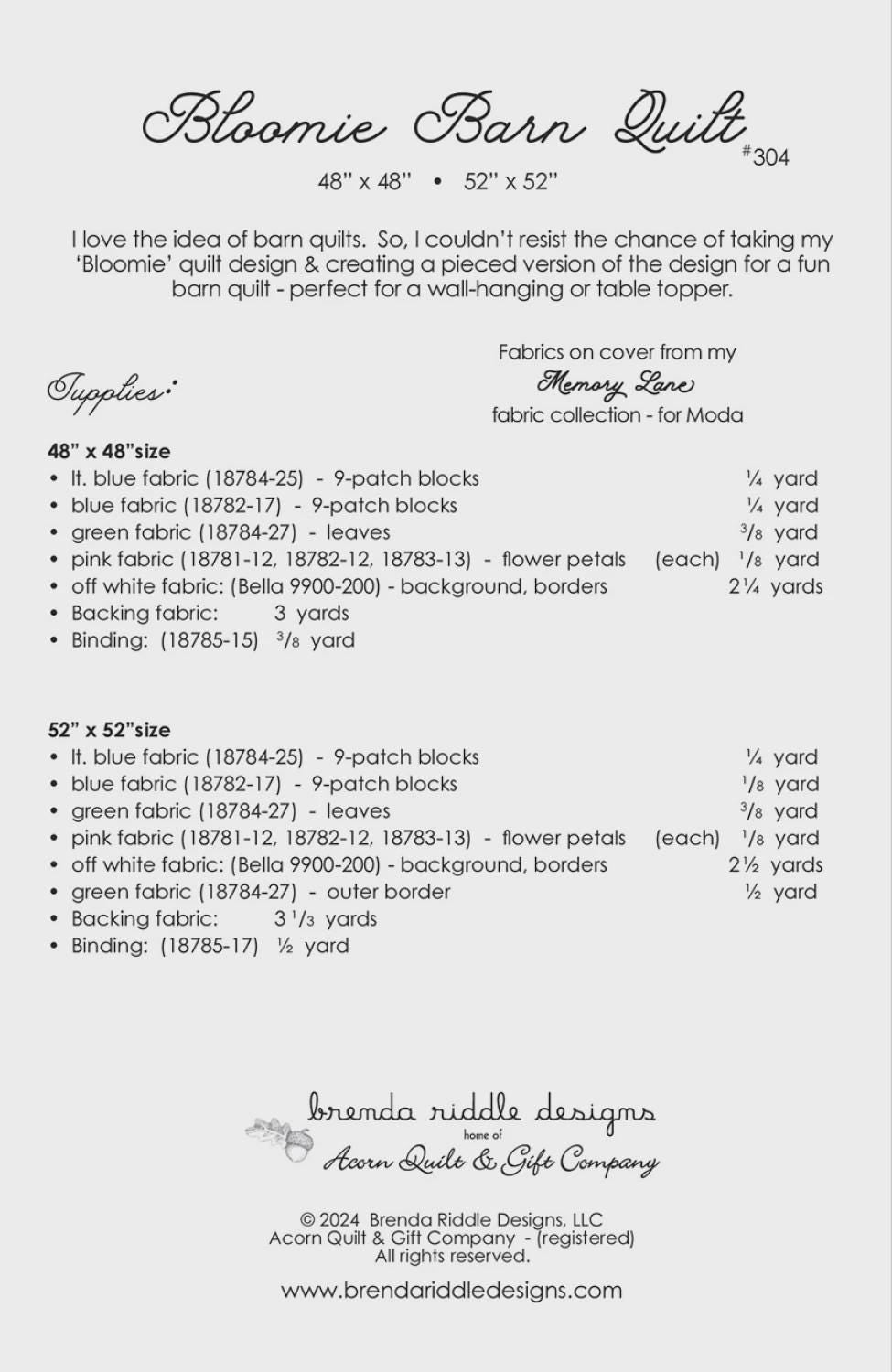 Bloomie Barn Quilt Pattern Paper Only AQ 304 by Brenda Riddle Designs for Acorn Quilts is backordered and will ship as soon as it is back in stock.