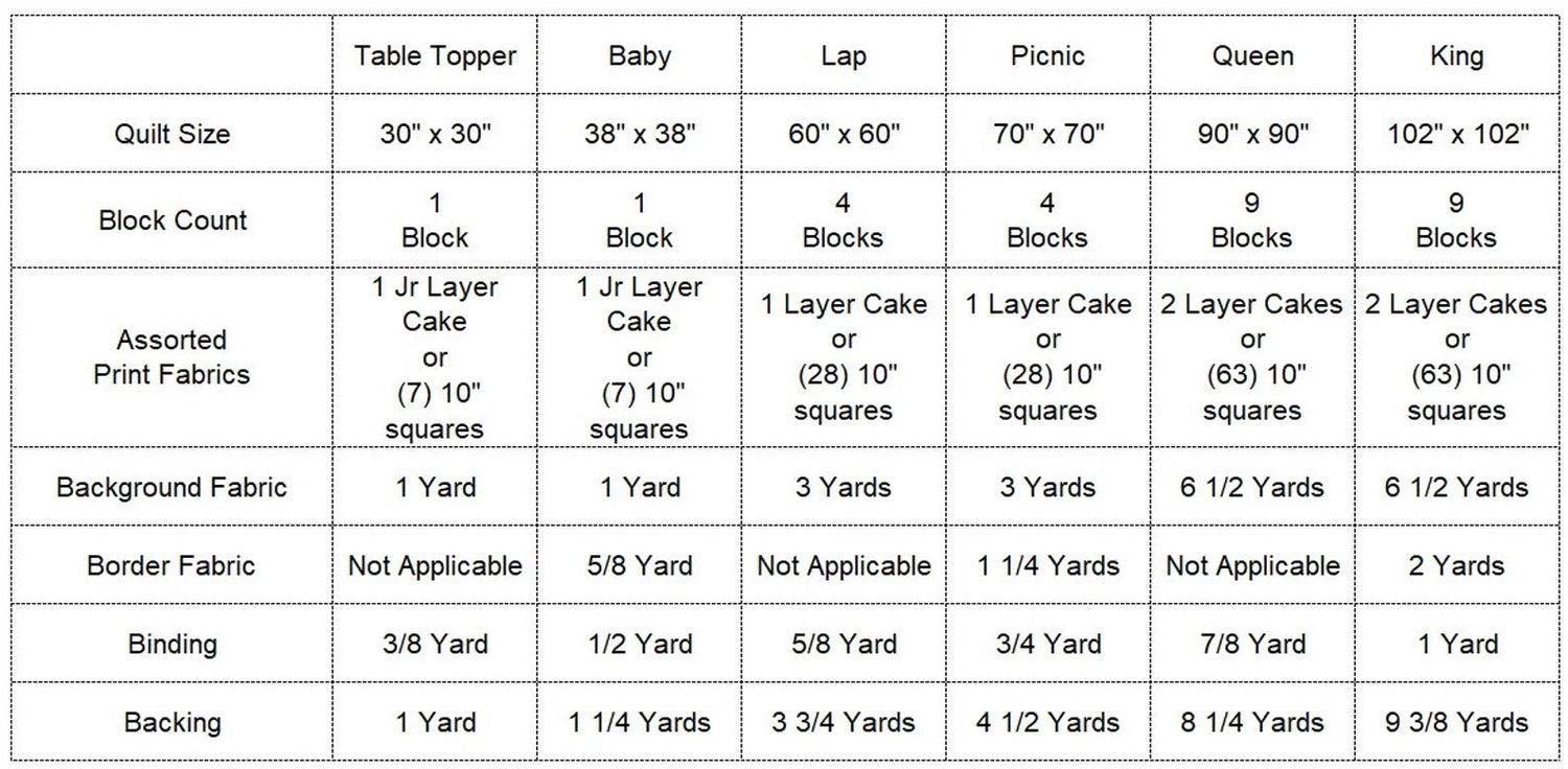 Pattern includes 6 size options: Table Topper, Baby, Lap, Picnic, Queen, and King. See picture for Material Requirements table.
