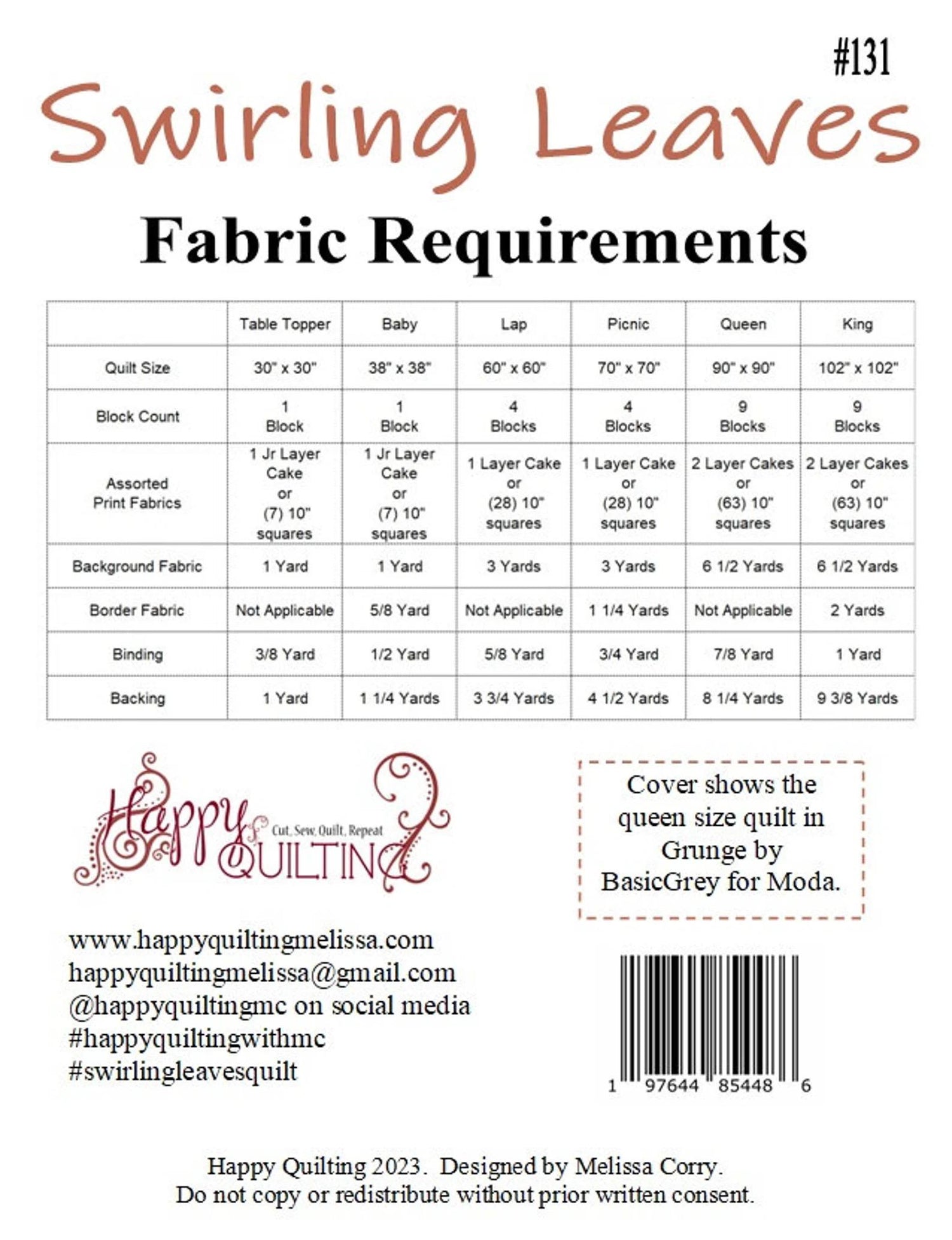 Swirling Leaves Quilt Pattern by Melissa Corry HQ1131 for Happy Quilting 5 sizes is backordered and will ship as soon as it is back in stock.