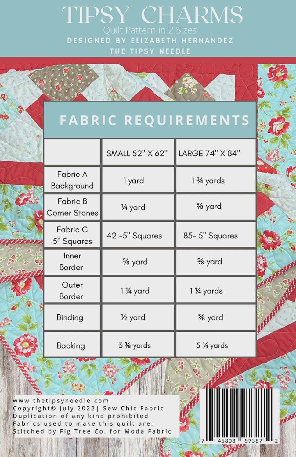 Tipsy Charms Quilt Pattern TTN-115 By Elizabeth Hernandez for The Tipsy Needle 52 x 62 and 74 x 84 is backordered and will ship as soon as it is back in stock.